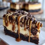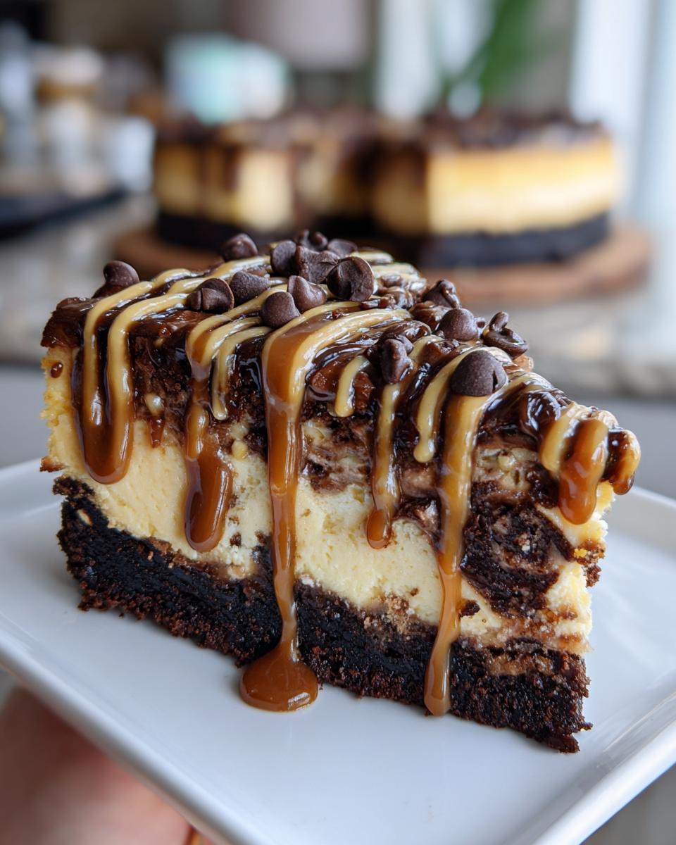 A rich and decadent dessert combining caramel, brownie, and cheesecake layers.